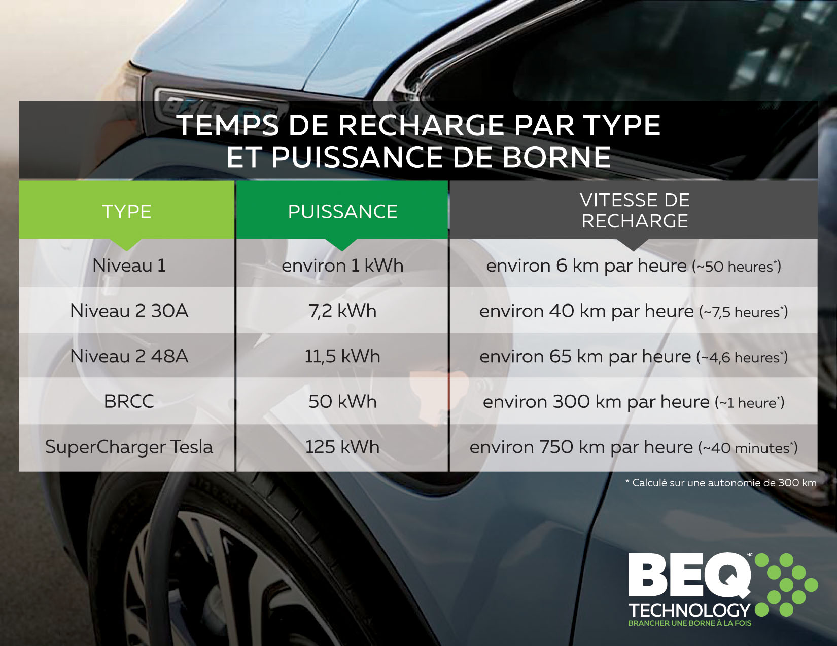 Borne de niveau 3 La borne de niveau 3 dite rapide ou BRCC (borne de recharge à courant continu) se retrouve souvent dans les stationnements de commerces ou le long des autoroutes pour permettre aux électromobilistes d’effectuer des recharges partielles afin de leur permettre d’avoir suffisamment d’autonomie pour terminer leur déplacement. Cependant il faut faire attention, car ces bornes de recharge rapide ont tendance à affecter davantage l’état de santé de la batterie en diminuant sa capacité maximale de recharge lorsqu’elle est utilisée trop fréquemment. Il est également recommandé de cesser la charge lorsque l’on atteint les 80% puisqu’à partir de ce point la borne de niveau 2 devient pratiquement aussi rapide et il deviendra moins dispendieux de terminer la charge sur une borne de niveau 2 que la BRCC.